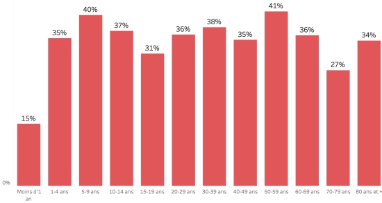Répartition et écarts des cas suspects, total depuis le 3 octobre : Moins d’1 an : + 661 (+2) 1-4 ans : 6,704 cas (+12) 5-9 ans : 4,891 cas (+4) 10-14 ans : 2,347 cas (+4) 15-19 ans : 1,732 cas (+4) 20-29 ans : 4,500cas (+4) 30-39 ans : 3,949 cas (+3) 40-49 ans : 2,826 cas (+4) 50-59 ans : 2,140 cas (+3) 60-69 ans : 1,450 cas (+4) 70-79 ans :776 cas (+4) 80 ans et + : 98 cas cas (non disponible) Hommes : 55,60% d’hommes (-) ; Femmes 44,40% (+) Taux de positivité par segment d’âge :