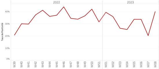 4 mars 2023 : (dernières données disponibles, précédent bulletin du Ministère 2 mars 2023 https://www.haitilibre.com/article-39010-haiti-cholera-bulletin-quotidien-124.html Données calculées depuis le premier cas confirmé (3 octobre 2022) Total des cas suspects : 35,917 cas +334 (+0,93%), précédent +1,565 Total des cas confirmés : 2,447* cas +0 (%), précédent +70 Total des cas suspects et confirmés hospitalisés : 31,013 cas +300 (+0,97%), précédent +1,516 Total des décès : 594** décès ((389 institutionnels (+0) et 205 communautaires (+0)) +0 (%), précédent : +0 * Pas de résultats de test publiés depuis 48h **Le Ministère n’a pas mis à jour cette information depuis 19 jours Bilan partiel du choléra en Haïti selon les données de la Direction d’Épidémiologie, des Laboratoires et de la Recherche du Ministère de la Santé publique et de la Population (MSPP). Taux de positivité hebdomadaire :