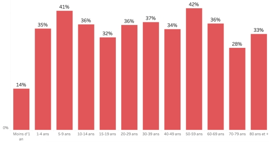 Répartition et écarts des cas suspects, total depuis le 3 octobre : Moins d’1 an : + 716 (+6) 1-4 ans : 7,274 cas (+89) 5-9 ans : 5,266 cas (+58) 10-14 ans : 2,547 cas (+21) 15-19 ans : 1,864 cas (+15) 20-29 ans : 4,798 cas (+41) 30-39 ans : 4,145 cas (+26) 40-49 ans : 3,022 cas (+24) 50-59 ans : 2,275 cas (+23) 60-69 ans : 1,571 cas (+16) 70-79 ans :860 cas (+15) 80 ans et + : 98 cas cas (non disponible) Hommes : 55,34% d’hommes (-) ; Femmes 44,66% (+) Taux de positivité par segment d’âge :