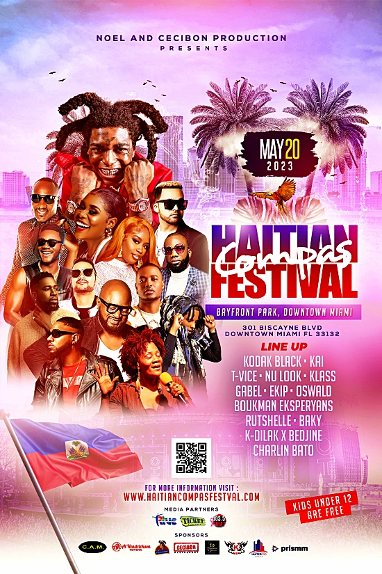 La 25e édition du Haitian Compas Festival revient au Bayfront Park Miami (301 Biscayne Blvd.). De plus, l'événement de cette année se déroulera sur deux jours : le samedi 20 mai et le dimanche 21 mai 2023, donc plus de plaisir et de bons moments en famille et entre amis. Attendez-vous à beaucoup de musique, de nourriture et de boissons ! Cette édition verra la participation de Kodak Black, KAI, T-VICE, Nu Look, Rutshelle, K-Dilak X Bedjine, Oswald, EKIP, Klass, Baky, Boukman Eksperyans, Gabel, Charlin Bato. Enfants moins de 12 and Gratuit Entrée de $25 à $145 GA : Entrée régulière Nourriture et boissons disponibles à l'achat VIP : Vue Premium sur la scène Nourriture et boissons disponibles à l'achat Dispositions des sièges disponibles Entrée accélérée Forfait 4 offres (Obtenez 4 billets pour le prix de 3) : Comprend 3 billets de fête et 1 billet de festival Achat en ligne : https://www.eventbrite.com/e/25th-anniversary-haitian-compas-festival-tickets-417493633697 Pour plus d'informations : https://www.haitiancompasfestival.com/