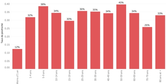 9 mai 2023 : (dernières données disponibles, précédent bulletin du Ministère 8 mai https://www.haitilibre.com/article-39566-haiti-cholera-bulletin-quotidien-182.html Données calculées depuis le premier cas confirmé (3 octobre 2022) Total des cas suspects : 43,720 cas +241 en 24h, la veille +16 en 24h Total des cas confirmés : 2,678* cas +0, la veille +0 en 24h Total des cas hospitalisés (suspects et confirmés) : 38,209 cas +222 cas en 24h, la veille +16 en 24h Total des décès : 685 décès ((460 institutionnels (+0) et 225 communautaires (+0)) +1, précédent +0 *Aucun résultat de tests publié par le Laboratoires du MSPP (ou absence de mise à jour du MSPP) depuis 20 jours Bilan partiel du choléra en Haïti selon les données de la Direction d’Épidémiologie, des Laboratoires et de la Recherche du Ministère de la Santé publique et de la Population (MSPP). Répartition des cas suspects, total depuis le 3 octobre : Moins d’1 an : + 989 (+6) 1-4 ans : 8,749 cas (+41) 5-9 ans : 6,249 cas (+43) 10-14 ans : 3,136 cas (+20) 15-19 ans : 2,303 cas (+18) 20-29 ans : 5,642 cas (+21) 30-39 ans : 4,815 cas (+21) 40-49 ans : 3,556 cas (+28) 50-59 ans : 2,698 cas (+12) 60-69 ans : 1,902 cas (+15) 70-79 ans : 1,101cas (+4) 80 ans et + : 449 cas (+12) Hommes : 54,43% d’hommes (+) ; Femmes 45,57 (-) Taux de positivité par segment d’âge :