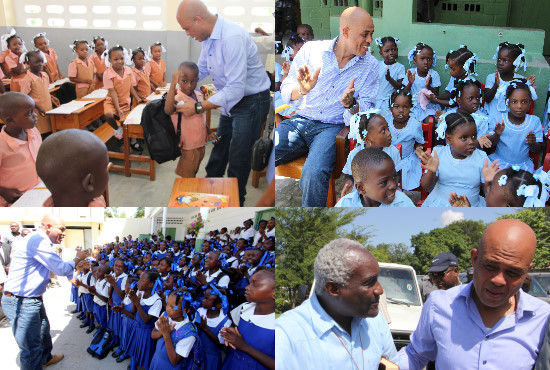 Michel Martelly, le Président de la République, a effectué, ce mercredi 5 octobre 2011, une tournée dans la commune de Hinche, dans le Plateau central, où il a visité quelques écoles et procédé à la distribution de kits scolaires. Il était accompagné, entre autres, du Directeur Général du Ministère de l'Education Nationale et de la Formation Professionnelle (MENFP), M. Pierre Michel Laguerre, du Délégué Départemental, M. Georges Garnier, et de la Conseillère en Education, Mme Geneviève Douyon. Le Chef de l'Etat s'est rendu à l'Ecole Notre Dame du Saint-Esprit de Hinche où il s'est entretenu avec la directrice de l'établissement, Sr Roselore Accilus, et le Coordonnateur des Ecoles Catholiques du Centre, le Rev. Père Jethro Noel. Le Président de la République a, en outre, annoncé que des démarches vont être entreprises en vue de subventionner le paiement des professeurs pour pouvoir réduire les frais scolaires annuels. « C'est à travers l'école que vous parviendrez à atteindre vos objectifs dans la vie. Vous pouvez compter sur votre Président. J'ai commencé avec l'accès à l'éducation. Nous allons continuer avec d'autres aspects, comme le recyclage des maîtres », a rassuré le Président Martelly, s'adressant à des centaines d'écoliers. L'accueil a été chaleureux. Le Chef de l'Etat, qui maintient sa promesse de garantir l'éducation gratuite aux enfants, a reçu un accueil similaire à l'Ecole Fondamentale d'Application (EFA), membre de l'EFACAP (Ecole Fondamentale d'Application et Centre d'Appui Pédagogique) de Hinche. Il a tenu à se rendre dans chaque salle de classe pour encourager les écoliers à prioriser leur éducation afin d'en tirer le maximum.