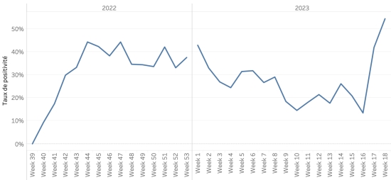 Nombre de tests réalisés : 8,029* +0 en 24h, précédent +0 en 24h Taux de positivité : 35,30%, précédent 35,30% Il est a noter que le pourcentage de 35,30% du taux de cas positifs sur les tests réalisés est bien inférieur au graphique publié le même jour par le Ministère, qui indique un taux de positivité proche des 60% *Aucune mise à jour de tests réalisés ces dernières 24h Évolution du taux de positivité :