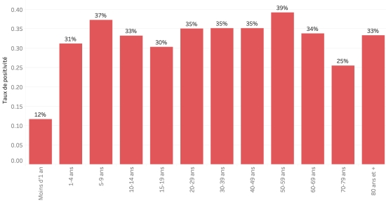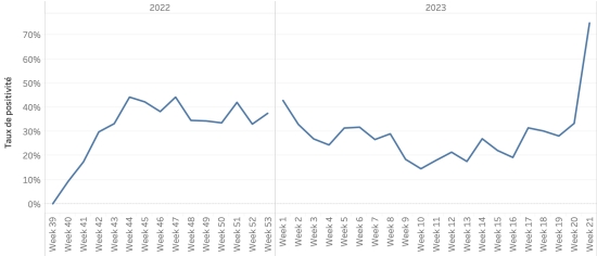Nombre de tests réalisés : 8,437 +19 en 24h, précédent +71 en 24h Taux de positivité : 34,79%, précédent 34,66% Il est a noter que le pourcentage de 34,66% du taux de cas positifs sur les tests réalisés est bien inférieur au graphique publié le même jour par le Ministère, qui indique un taux de positivité moyen supérieur à 70% pour la semaine épidémiologique #21 Évolution du taux de positivité :