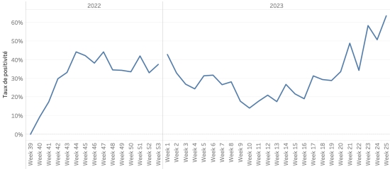 24 Juin 2023 : (dernières données disponibles, précédent bulletin du Ministère 23 Juin https://www.haitilibre.com/article-39941-haiti-cholera-bulletin-quotidien-228.html ) Données calculées depuis le premier cas confirmé (3 octobre 2022) Total des cas suspects : 53,501 cas +84 en 24h, précédent +420 en 24h Total des cas confirmés : 3,279* cas +0 en 24h, précédent +13 en 24h Total des cas hospitalisés (suspects et confirmés) : 47,033 cas +86 hospitalisations en 24h, la veille +371 en 24h Total des décès : 765 décès ((522 institutionnels (+0) et 243** communautaires (+0)) +0, précédent +0 Bilan partiel du choléra en Haïti selon les données de la Direction d’Épidémiologie, des Laboratoires et de la Recherche du Ministère de la Santé publique et de la Population (MSPP). *Aucune donnée actualisé depuis 1 jour. Sur le taux moyen de cas confirmés testés et le nombre de cas suspects de choléra depuis le début de l’épidémie, le nombre de cas confirmés devrait se situer autour de 19,000. **Données communautaires très partielles, actualisation irrégulière. Non actualisé depuis 3 jours. Répartition des cas suspects, total depuis le 3 octobre : (Mise à jour partielle du Ministère) Moins d’1 an : 1,317 cas (+8) 1-4 ans : 10,625 cas (+21) 5-9 ans : 7,638 cas (+10) 10-14 ans : 3,915 cas (+9) 15-19 ans : 2,904 cas (+5) 20-29 ans : 6,840 cas (+7) 30-39 ans : 5,801 cas (+8) 40-49 ans : 4,364 cas (+4) 50-59 ans : 3,284 cas (+7) 60-69 ans : 2,331 cas (+3) 70-79 ans : 1,351 cas (+1) 80 ans et + : 553 cas (+1) Hommes : 53,91% d’hommes (=) ; Femmes 46,09 (=) Taux de positivité par segment d’âge :