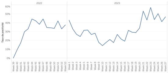 Nombre de tests réalisés : 9,670 +59 en 48h, précédent +8 en 24h Taux de positivité : 35,69%, précédent 35,64% Évolution hebdomadaire du taux de positivité (semaine 27) :