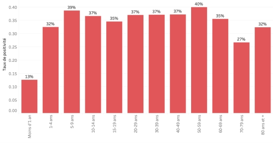7 juillet 2023 : (dernières données disponibles, précédent bulletin du Ministère 6 juillet https://www.haitilibre.com/article-40029-haiti-cholera-bulletin-quotidien-239.html ) Données calculées depuis le premier cas confirmé (3 octobre 2022) Total des cas suspects : 55,773 cas +118 en 24h, précédent +406 en 24h Total des cas confirmés : 3,452* cas +0 en 24h, précédent +26 en 24h Total des cas hospitalisés (suspects et confirmés) : 49,275 cas +119 hospitalisations en 24h, la veille +338 en 24h Total des décès : 780 décès ((536 institutionnels (+4) et 243** communautaires (+0)) +4, précédent +5 Bilan partiel du choléra en Haïti selon les données de la Direction d’Épidémiologie, des Laboratoires et de la Recherche du Ministère de la Santé publique et de la Population (MSPP). *Non actualisé par le Laboratoire National ces dernières 24h. Sur le taux moyen de cas confirmés testés et le nombre de cas suspects de choléra depuis le début de l’épidémie, le nombre de cas confirmés devrait se situer au dessus de 19,000. **Données communautaires très partielles, non actualisées. Répartition des cas suspects, total depuis le 3 octobre : Moins d’1 an : 1,3784 cas (+8) 1-4 ans : 11,108 cas (+24) 5-9 ans : 7,954 cas (+19) 10-14 ans : 4,105 cas (+9) 15-19 ans : 3,053 cas (+6) 20-29 ans : 7,124 cas (+16) 30-39 ans : 6,050 cas (+14) 40-49 ans : 4,532 cas (+6) 50-59 ans : 3,398 cas (+6) 60-69 ans : 2,445 cas (+4) 70-79 ans : 1,439 cas (+2) 80 ans et + : 587 cas (+4) Hommes : 53,76% d’hommes (-) ; Femmes 46,24 (+) Taux de positivité par segment d’âge :
