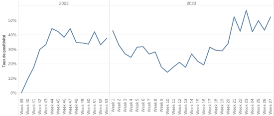 Évolution hebdomadaire du taux de positivité (semaine 27) :