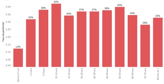 Nombre de tests réalisés : 10,025 +50 en 24h, précédent +92 en 24h Taux de positivité (moyen depuis le débit de l’épidémie) : 35,74%, précédent 35,69% Évolution hebdomadaire du taux de positivité (semaine 29) :