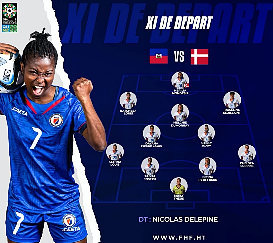 Ce mardi 1 août 2023 le sélectionneur Nicolas Delépine a communiqué le nom des 11 Grenadières qui défendront les couleurs d’Haïti jusqu’au bout face au Danemark (13e au monde) lors du 3ème et dernier match de poule du Groupe D de la Coupe du Monde féminine de la FIFA. Notons que Melchie Daëlle Dumornay était de retour alors que Roseline Eloisssaint remplace Roselord Borgela qui a démarré sur le banc. Le match a été dirigé par une Sud-coréenne Hyeon-Jeong Oh. Elle a été accompagnée de sa compatriote Misuk Park (Corée du Sud), de Makoto Bozono (JAP) et Akhona Makalima (Afrique du Sud). Onze de départ : Gardien de but Kerly Theus, FC Miami City (USA) Défenseures : Tabita Joseph, Stade Brestois 29 (France) Betina Petit-Frere, Stade Brestois 29 (France) Kethna Louis, Montpellier HSC (France) Chelsea Surpris, Grenoble Foot 38 (France) Milieux de terrain : Dayana Pierre-Louis, Gpso Issy (France) Sherly Jeudy, Grenoble Foot 38 (France) Batcheba Louis, FC Fleury 97 (France) Nerilia Mondesir, Montpellier HSC (France) Attaquantes : Melchie Daelle Dumornay, Olympique Lyonnais (France) Roseline Eloissaint, FC Nantes (France) Entraîneur : Nicolas Délépine