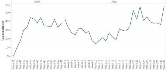 *La baisse observé sur le graphique pour les semaines 25 à 30 est le résutat de l’absence fréquente de plusieurs jours sans actualisation des données par le laboratoire.