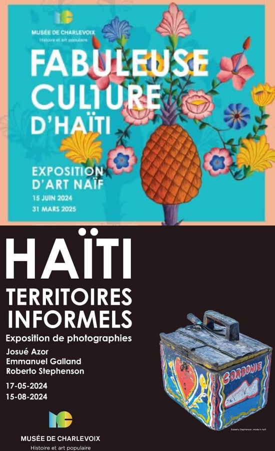 L’Ambassade d’Haïti au Canada vous recommande vivement de visiter deux expositions sur Haïti au Musée de Charlevoix à La Malbaie (P.Q). Exposition phare:« FABULEUSE CULTURE D’HAÏTI » Le musée présente pour la première fois au public une cinquantaine de tableaux de peintres d’Haïti, issus de sa collection. Ces maîtres de l’art naïf livrent la vision d’un pays rêvé ainsi qu’une représentation d’Haïti avec sa joie de vivre et son identité. Du 15 juin 2024 au 31 mars 2025 Exposition : « HAÏTI, TERRITOIRES INFORMELS » Présentation de trois points de vue de trois photographes sur Haïti et principalement sur sa capitale Port-au-Prince : Josué Azor, Emmanuel Galland et Roberto Stephenson. L’un y vit, l’autre y a souvent séjourné et le troisième y a vécu plus de 20 ans. Du 17 mai 2024 au 15 août 2024