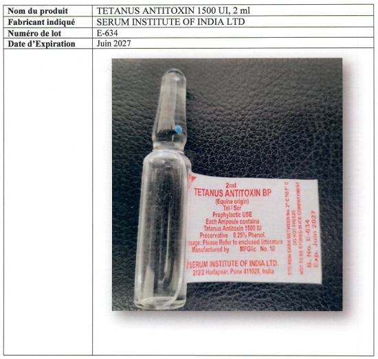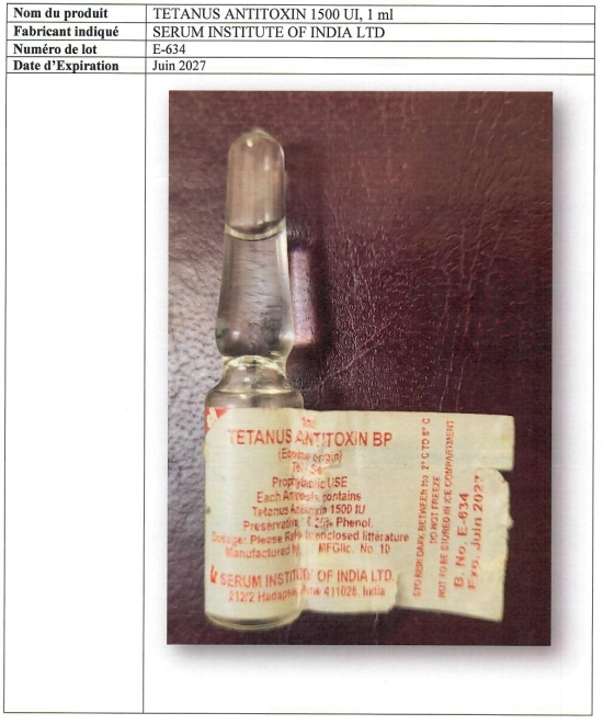 L’emballage primaire est rédigé en anglais et indique un numéro de lot E-634 qui n’a pas de traçabilité en Haïti. La date d’expiration (06/2027) est mentionnée sur l’étiquette des ampoules de 1ml et de 2 ml. En termes de risques, l’utilisation du « Tetanus antitoxin 1500 UI, 1 et 2 ml » falsifié induit un traitement inefficace et d’autres risques plus graves pour la santé du patient, jusqu’à mettre sa vie en danger. Par ailleurs, dans le souci de protéger la santé de la population, le MSPP appelle à la vigilance. L’achat, la distribution, la vente et l’utilisation de tout produit répondant à ces caractéristiques sont formellement interdits sur le territoire haïtien. Le MSPP exhorte donc tous les professionnels de santé à signaler tout incident relevant de la pharmacovigilance à la Direction sanitaire de leur juridiction respective pour suites immédiates appropriées. S/ HaïtiLibre