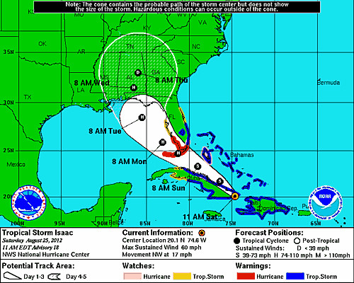À 17h00, le centre ISACC est localisé à 21.3N 76.0W, à 312 km au Nord-Ouest d'Haïti, il longe la côte Nord de Cuba en direction du Sud de la Floride, bien que son centre s'éloigne d'Haïti d'heure en heure, la prudence reste de rigueur. Le Centre national de météorologie (CNM) informe que le niveau rouge est maintenu, et que les bandes périphériques constituées par des grosses cellules nuageuses convectives, très intenses et dangereuses d'ISAAC restent et demeurent sur Haïti cet après-midi en dépit de l'éloignement progressif de son centre. Des fortes pluies, des vents et orages violents associés à ces masses nuageuses convectives sont par conséquent toujours possibles à l'échelle du pays cet après-midi et ce soir. Une amélioration graduelle de la situation est prévue pour demain. Le Président de la République, Michel Martelly, et la Première Dame, Mme Sophia Martelly, demande à la population de continuer à faire preuve de prudence. La Présidence demande particulièrement aux personnes des zones à risques de rester vigilantes et d'appliquer scrupuleusement les consignes de sécurité. Le Président de la République adresse "ses félicitations aux différents acteurs impliqués dans la gestion de cet évènement, et les invite à rester toujours déterminés en vue de secourir les personnes nécessiteuses," annonçant qu'un train de mesures a été adopté par la Présidence pour venir en aide aux familles haïtiennes. Sur le terrain À Bainet, les plantation de bananes, cocotiers, avocats etc... ont été affectées par les inondations, tandis que les récoltes d’oranges et d'haricots et de petit mil sont compromises. De nombreux habitants ont perdus leur biens. La ville de Marigo dans le Sud-Est a été inondée. La rivière Massacre à Cayes-Jacmel est sortie de son lit. 64 maisons ont été affectées à Belladère selon la DPC. Dans la commune de Thomassique l'on rapporte des pertes de bétail. À Ganthier 50 maisons ont été totalement détruites, une dizaine partiellement, et des pertes de bétails. De nombreuses plantations sont perdues dans le Plateau central.