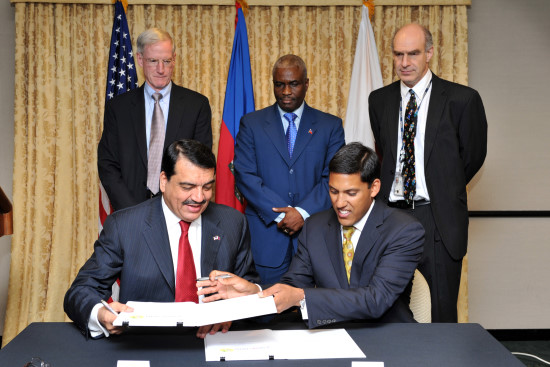 Administrateur de l'USAID Rajiv Shah (à droite) et Mohamed Bin Abdulla Al-Rumaihi, l'ambassadeur du Qatar aux États-Unis et président du Fonds Haïti Qatar, signent un accord de subvention conjointe le 6 Juin 2013, pour financer le développement d'une nouvelle communauté en Haïti. « L'accord de partenariat avec l'USAID est un témoignage de l'engagement de l'État du Qatar à travers le Qatar Haiti Fund, pour aider le peuple haïtien [...] Cet accord va nous permettre de travailler ensemble pour construire « Qatar City », qui mettra en vedette des logements permanents pour les haïtiens touchée par le séisme, une école professionnelle et une zone commerciale, afin de générer une micro-économie durable » a déclaré Mohamed Bin Abdulla Al-Rumaihi, l'Ambassadeur du Qatar aux États-Unis et président du Qatar Haiti Fund. La collaboration du Fonds avec l'USAID mettra en avant des approches novatrices en matière de logement permanent en Haïti. Chaque unité de deux pièces de 35 mètres carrés répondra aux normes parasismiques et comprendra l'eau courante, cuisine, toilettes à chasse d'eau et des panneaux solaires pour l'éclairage et la recharge de petits appareils électroniques. Un espace ouvert sera mis à disposition dans le développement pour accueillir les futures infrastructures telles que des écoles, des centres communautaires et des jardins. Les bénéficiaires des maisons seront sélectionnés à travers un processus mis en place par le Gouvernement d'Haïti, en collaboration avec la communauté des donateurs et des ONG. Ce processus, utilisé dans d'autres programmes de logement post-séisme, est effectuée par un Comité local de sélection des bénéficiaires composé de représentants des secteurs public et privé. USAID va commencer le processus d'appel d’offres concurrentiel fin Juin pour choisir un entrepreneur pour développer le site et construire les maisons. En plus des maisons construites à travers le Qatar Haiti Fund, l'USAID est en train de construire 906 maisons sur de nouvelles implantations et est partenaire avec d'autres bailleurs de fonds et des ONG pour la construction d'environ 2.200 maisons supplémentaires. HL/ SL/ HaïtiLibre