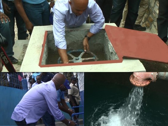 De retour aux Gonaïves, le Président a visité les importants travaux de réhabilitation du réseau hydraulique devant alimenter en eau toute la partie sud de la ville et procédé à la mise en service du réseau. La réhabilitation de ce réseau, alimenté par un réservoir de 960 mètres cubes, permettra à la Direction Nationale de l'Eau Potable et d'Assainissement (DINEPA) de desservir plus de 30 000 bénéficiaires des zones : Pont Gaudin, Centre Ville, Raboteau, Jubile, Route Nationale, La Martninière, Bigot, Biernnac, Christophe, Bois d’Orme, Dattes, Sajous, et Gattereau. Ces travaux ont consisté entre autres à la pose de 100 m de conduites de fonte de 8’’ dans la rivière, la fouille et la pose de 140 m de conduites de 8’’ en fonte, la fouille et la pose de 340 m de conduites, la pose d’accessoires de raccordements, la désinfection massive, la réparation et mise en eau et la réhabilitation d’une douzaine de kiosques de distribution d’eau.