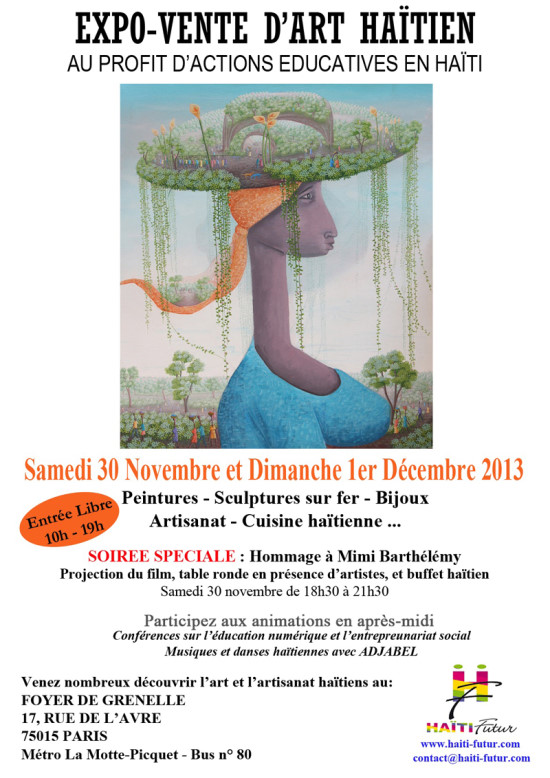 La 19ème édition de l’exposition-vente d’art et d’artisanat haïtien, de l’association Haïti Futur, se tiendra le samedi 30 novembre et dimanche 1er décembre 2013, de 10h00 à 19h00. Durant 2 jours, plus d’un millier de visiteurs comme chaque année, auront l’occasion de découvrir : peintures, fers sculptés, artisanat, bijoux réalisés par les artisans et les peintres haïtiens ainsi que des produits du commerce équitable. Des conférences sur l’entreprenariat social et l’éducation numérique en Haïti sont également prévues tout au long du week-end, ainsi que des dégustations de plats traditionnels. Le groupe Adjabel se produira accompagné de danseuses.Une soirée exceptionnelle sera organisée le samedi 30 novembre à partir de 18h30 en hommage à la conteuse et écrivaine Mimi Barthélemy, décédée le 27 avril dernier, avec la projection du film « La voix de la conteuse » qui sera suivie d'une table ronde sur le rayonnement des artistes haïtiens à l’étranger (Eddy Saint Martin, Henry Roy, Atissou...)