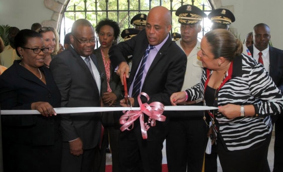 Lundi, le Président Michel Martelly, accompagné de son épouse Sophia Martelly, a inauguré, à Delmas 83 le nouveau Bureau de lutte contre la violence faite aux femmes et aux Filles. Cette nouvelle structure du Ministère à la Condition Féminine et aux Droits des Femmes (MCFDF) vise à combattre tout acte causant ou susceptible de causer aux femmes et aux filles des souffrances physiques ou psychologiques que ce soit dans la vie publique ou privée. En présence de Marie Yanick Mézile, la Ministre à la Condition Féminine et aux Droits des Femmes, de Jean Renel Sanon, le Ministre de la Justice et de la Sécurité Publique, de Josette Darguste, la Ministre a.i. de la Culture, de l'Ambassadrice des États-Unis en Haïti, Mme Pamela White, et de représentants d'organisations nationales et internationales partenaires et d'associations, le Chef de l'État a rappelé la nécessité que cette lutte soit menée par tous les secteurs de la société « La mobilisation de chacune et de chacun est essentielle pour combattre ce fléau. Mais avant tout, l’État doit prendre ses responsabilités et lutter contre l’impunité qui sévit dans le pays en matière de violences de genre. Grâce à la détermination du Ministère de tutelle, au plaidoyer d’organisations de femmes, à l’engagement du Ministère de la Justice et au support continu de partenaires internationaux, la Police Nationale d’Haïti (PNH) est aujourd’hui apte à agir pour freiner ce fléau. »