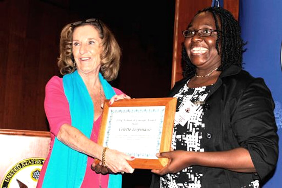 This Friday, as part of the "International Women of Courage" program, initiated for 3 years by the State Department to recognize the initiatives and actions undertaken by women around the world who play a prominent role in their society, Pamela White, Ambassador of the United States in Haiti, during a ceremony at the U.S. Embassy, has awarded this year the adward "Woman of Courage Haiti 2014" to Ms. Colette Lespinasse, Coordinator of Support Group for Returnees and Refugees (GARR), who has dedicated his professional life to advocating in favor of immigrants and Haitian women and contributed to better relations between Haiti and the Dominican Republic, as well as for her active participation in the socio-political life in Haiti. In his speech Ambassador White emphasized "Colette Lespinasse is a model for a new generation of young women and girls all over Haiti. I really hope that his experience of work in the social with farmers, women, returnees, those who live in poor neighborhoods and communities of the Haitian-Dominican border will be a source of inspiration not only for women, but for the Haitian people so they are more involved in their communities in their region and their country."