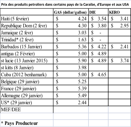 Recent situation of decline in international cost and price changes at the pump : At the end of the 2013-2014 fiscal year, the Haitian government was committed to eliminate the subsidy on petroleum products by the end of the 2014-2015 fiscal year; A timetable has been established in this sense : It was expected to proceed by four (4) price increases in 2015 to be able to fully eliminate the subsidy https://www.haitilibre.com/en/news-12238-haiti-notice-painful-increases-in-fuel-prices.html This allowed to build upon forecasts of petroleum revenues of around 7.8 billion gourdes for the fiscal year; Thus, a first increase in prices took place in October 2014, a gallon of gasoline has increased from 200 to 215 gourdes, diesel gallon increased from 162 to 177 gourdes per gallon and diesel increased from 161 to 171 gourdes; However, the context of the fall in prices of petroleum products on the international market has been at the favor of the automatic elimination of subsidies on petroleum products and allowed the redesign of the phasing out of the subsidy program envisaged for the year. This favorable situation allowed to record petroleum revenues of around 2.2 billion gourdes in the first four months of fiscal year 2014 to 2015 and to anticipate that the budget estimates of petroleum revenues would be reached under the price assumption slightly revised upward and revised upward and consider lower prices at the pump. But, faced with the decline in Petrocaribe Fund's resources caused by the oil price on the international market, a sharp fall in prices at the pump may be catastrophic for the balance of public finances and cause a deterioration of conditions macroeconomic detrimental to the stability and the continuation of certain policies aimed at improving household living conditions; In this context, the Government conduct negotiations with drivers' unions, who conducted a decision to lower prices of petroleum products https://www.haitilibre.com/en/news-13095-haiti-flash-fuel-price-decrease-the-government-made-an-extra-effort.html Gazoline 20 Gourdes Diesel 20 Gourdes Kerosene 15 Gourdes These adjustments were accompanied by the commitment of the state to reactivate as soon as the automatic adjustment mechanism. Budgetary impact of new adjustment and comparison with the Caribbean : The new adjustment should allow oil revenue of around 8 billion gourdes for the year, if the adjustment mechanism is activated and if an increase does not exceed 5% of the CIF (Cost, Insurance and Freight) in gourdes, which is within the limits of budget estimates for 2014-15. But the combined drop in Petrocaribe resources leads to a revision of budget predictions credit of the exercise on the Petrocaribe funding to nearly half. Compared to other Caribbean countries, the price in Haiti is very close to the Dominican Republic, with a difference of nearly 10 cents less than at Cuba. It is clearly lower than in most European countries such as France, Belgium and Norway where gasoline is more expensive.