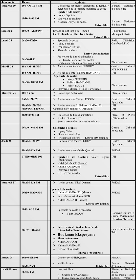 The festival management informs the public that the 6th edition of the Intercultural Tale Festival "Kont anba tonèl" will take place from March 20 to 28 on the stages of the Knowledge and Freedom Foundation (FOKAL) (143 Avenue Christophe, Port-au-Prince) and of Pyepoudre Cultural Centre (312, Route de Bourdon, Port-au-Prince), around the theme "Telling to give flesh to our dreams".