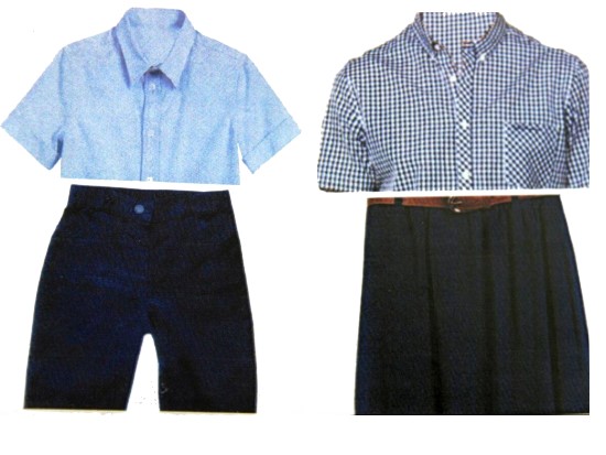 - At the fundamental level: shirt or blouse with blue and white tiles on navy blue pants or skirt.