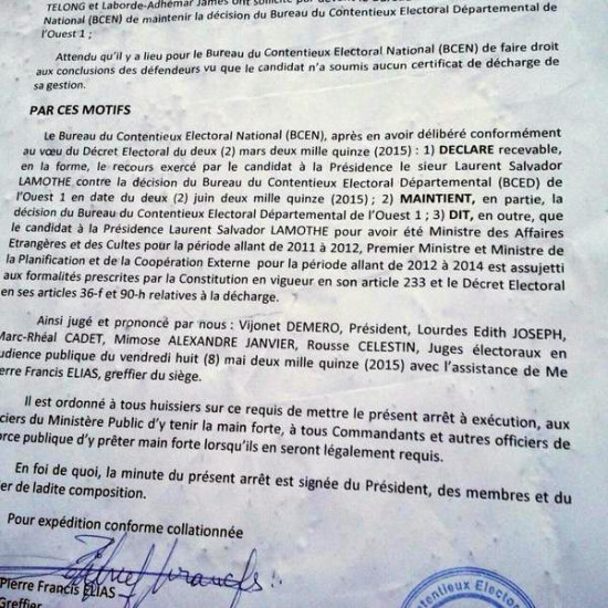 Simon Dieuseul Deras (for candidacy not in accordance with the Electoral Decree) Anthony Benneth for non-compliance with the law (probably dual nationality) 4 candidates maintained : Jovenel Moise, Jacky Lumarque, Moise Jean Charles and Antoine Joseph The US Embassy without explicitly mention the verdicts of BCEN, launched a warning to American nationals living in Haiti against possible disturbances that could occur on Thursday 11 and Friday, June 12, 2015. See aloso : HL/ HaitiLibre