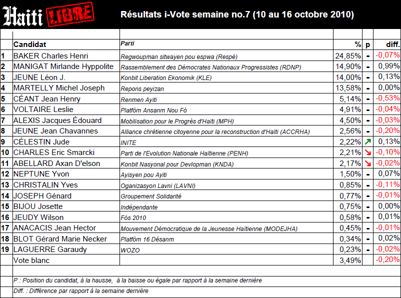 Haiti - i-Votes : Results seventh week 17/10/2010 11:08:03