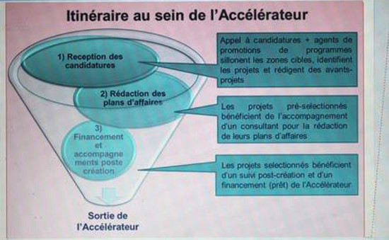 As part of its Support program for the productive development, initiated in 2003, designed to provide support to Micro, Small and Medium Enterprises (MSMEs), the Ministry of Commerce and Industry (MCI) to overcome the job creation problemdue to low levels of productivity and the lack of development of infrastructure in rural areas, presented the first component of the program called "Business Accelerator", in partnership with the Inter-American Development Bank (IDB). The Business Accelerator is a comprehensive support offered to newly created enterprises and to the holders of new projects in order to boost primarily the agricultural value chain and agro-industry in order to expand opportunities for decent jobs and sustainable livelihoods in the regions. The Business Accelerator is a set of initiatives that promote the rapid development of small enterprises in priority sectors identified in the framework of the overall strategy of private sector development and especially for the creation of Micro Industrial Parks. It is also a device hosting companies in gestation or in activity and accelerate their growth through support mechanisms (supporting the development of business proposals, technical and managerial assistance), training and access to funding.