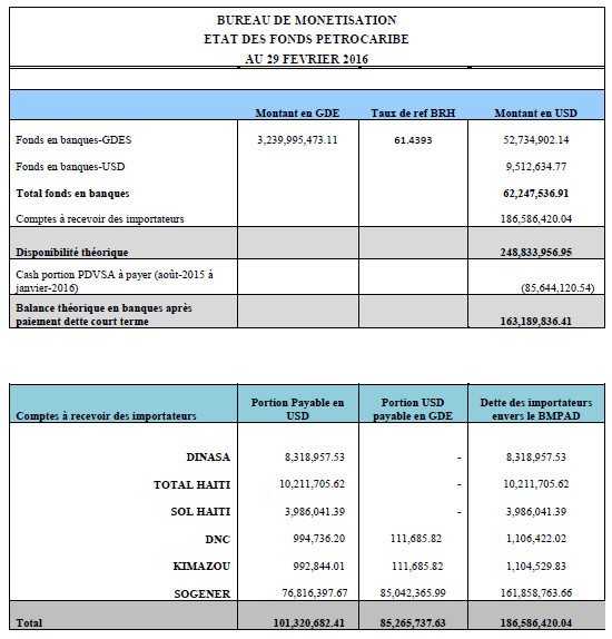 The Office of Monetization of Development Aid Programs (BMPAD), responsible for the management of the Petrocaribe agreement, wishes to reassure the population that "there will be no fuel shortage in Haiti" and take this opportunity to inform that it has received on March 7 a cargo of 210,000 barrels of petroleum products (diesel, gasoline and kerosene) and next two orders totaling 500,000 barrels were confirmed. In addition, Eustache Saint-Lot, the Director of BMPAD inform the general public and interested parties in particular that the accumulation of eight months' arrears to the Venezuelan Supplier, July 2015 to today, is due to the scarcity of foreign currency in the local market ensuring that "The money paid during that period by the oil companies is available".