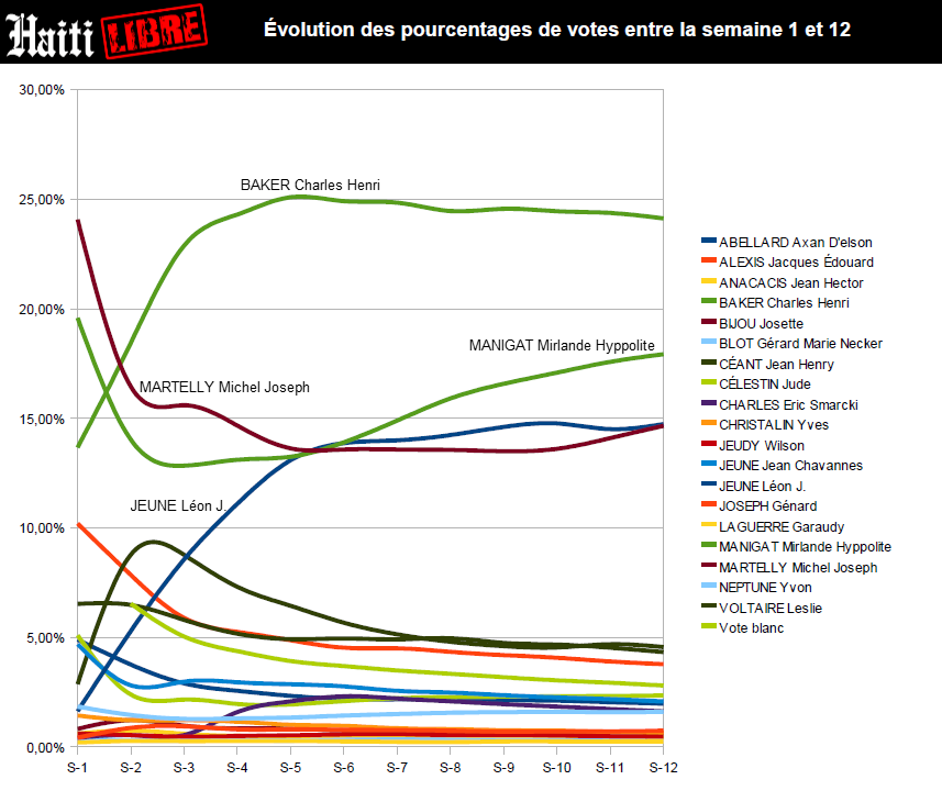 NON-CUMULATIVE results, last week from November 14 to 20, 2010 Number of i-Votes : 2,322 (1) Mirlande Manigat : 510 i-votes (21.96 %) (2) Charles Henri Baker : 495 i-votes (21.32 %) (3) Michel Joseph Martelly : 489 i-Votes (21.06%) (4) Léon Jeune : 403 i-Votes (17.36 %) (5) Jean Henry Céant : 71 i-Votes (3.06 %) (6) Jude Célestin : 61 i-Votes (2.63 %) (7) Jacque Édouard Alexis : 55 i-Votes (2.37 %) (8) Leslie Voltaire : 48 i-Votes (2.07 %)