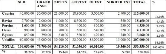 On Monday, the Ministry of Agriculture, Natural Resources and Rural Development (MARNDR) released a first partial report of extensive damage caused by Hurricane Matthew in the agricultural sector. For the Southeast department, 17.325 hectares of farmland have been affected, the most affected crops in areas of Marigot, Marbial, Fonds Jean Noel, Macary are sorghum, figue-banane, etc... Irrigation systems of Charlier and Chanterelles re damaged. The estimated production losses amount to 177,730 metric tons. For the Nippes department, there are 1,500 hectares of plains that were affected. In the zones of Plaisance du Sud, Petite-Rivière des Nippes, Baradere, Grand Boucan, Anse-a-Veau, the most affected crops are Sorghum, Figue-banane, congo peas and fruit (advocates, tree-a-bread, citrus, coconut, etc...) banana production structure is damaged. At the livestock and fisheries the Ministry reported goats losses (70,000 heads), sheep (about 24,000 heads) attle (about 20,000 heads), horses (about 200 heads), poultry. For the South Department, more than fifty perimeters are affected. In the area of Ile-à-Vache, Port-Salut, coteaux, Tiburon, Torbeck, Aquin, Cavaillon,the most affected crops are rice, corn, banana, fruit and forest trees. At the livestock and fisheries, loss of goats, sheep, cattle, etc... loss of fishing equipment (boats, nets...) Rice and corn processing buildings are damaged. The irrigation system of Dory is heavily damage In the department of Grand'Anse, 30,000 hectares of root crops, 8,000 hectares of coffee, 3,000 hectares of beans were affected. In areas of the Les Irois, Abricot, Pestel, Corail, Beaumont, the coffee plantations, fruit trees (tree-a-bread, avocados, citrus...) are the most affected. The Ministry eported the total destruction of fishing equipment (boats, drink, nets...) and the loss of about 150,000 goats, 35,000 sheep, 82,000 pigs. For the West department 11,000 hectares of farmland were affected. In areas of Petit-Goâve, Léogâne, Grand-Goâve, Carrefour, Kenscoff, Arcahaie, Thomazeau/Cornillon, Fonds Verettes, the most affected crops are sorghum, pigeon peas, vegetable crops, coffee, bananas, beans (8,675 seed pots), 200 lbs of cabbage seed, 6,000 lbs of carrot seed, yam. The Ministry reported the loss of fishing gear (boats, nets, and other), of horses, sheep (130), cattle (over 1,000), mullet...) 5,728 goats, pigs (620 to Kenscoff only) equine (257). For the Northwest department, 11,550 hectares of farmland were affected. In Baie de Haine, Môle Saint-Nicolas, the most affected crops are bananas, beans, corn, pigeon peas, cassava, peas strain, unknown peas, peanut, carrot, papaya, fruit trees and forest. The Ministry reported losses of fishing equipment. The estimated production losses amount to 93,200 metric tons. For the department of Artibonite, 470 hectares of farmland have been affected, the most affected crops are bananas, cereals (rice, maize, sorghum), market gardening, legumes (peas strain, beans, pigeon peas...) sugarcane, tubers (cassava, yam...) fruit and forest trees. In areas of Saint-Marc (5th Section, Bocozele). 50 sailboats and boats were damaged. The Ministry report the loss of about 600 head of goats, 180 pigs, 80 cattle, 620 poultry. 10,000 salt ponds flooded in Anse Rouge; irrigation systems damaged in Sarazin, Guilette, Bassin Tortue, Vieux Camp, Colombier, Vieux Cotton, Bois Neuf, Ka-Philippe, Martino (Marmelade), Anse Rouge, Grande Saline, Saint Marc, Terre Neuve, Ennery; 40 km agricultural roads damaged. Partial assessment of the missing livestock population during the passage of Hurricane Matthew