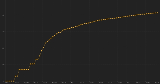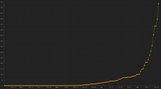 GLOBAL SITUATION : Friday, May 22, 2020, the number of people infected worldwide with the Covid-19 coronavirus since the start of the pandemic (Official source), amounted to 5,127,125 confirmed cases (+ 2.24% ) +112.182 in 24 hours (the day before: +96.005). Number of contaminated countries 188 (unchanged). Bulletin of the day before : https://www.haitilibre.com/en/news-30831-haiti-covid-19-daily-bulletin-may-21-2020.html Since the start of the pandemic 1,964,622 + 111,047 people have been cured of Covid-19 worldwide. Since the start of the pandemic 333,398 people have died from Covid-19 worldwide (+ 1.5%) + 4.936 in 24 hours (the day before: +4.739). The number of active cases worldwide (excluding death and recovery) is currently 2,829,105 +52,325 in 24 hours (the day before: -19,850). TOP 5 of the countries with the most active cases : 1st - USA: 1,184,611 active cases +20,509 (the day before: +16,771) 2nd - Russia: 223,374 cases +1,600 (the day before: +1,433) 3rd - United Kingdom: 214,988 cases +2,271 (the day before: -900) 4th - Brazil: 164,080 cases +8,043 (the day before +8,929) 5th - France: 89,757 cases -336 (the day before: -137) TOP 5 of the countries with the most deaths : 1st - USA: 94,729 +1,290 (the day before +1,501) 2nd - United Kingdom 36,124 deaths +338 (the day before: +364) 3rd - Italy: 32,486 deaths +156 (the day before: +161) 4th - France: 28.196 deaths +83 (the day before: +100) 5th - Spain: 27,940 deaths +52 (the day before: +110) DIASPORA : United States : Cases confirmed since the start of the epidemic : 1,184,611 +20.509 in 24h (the day before: +16,771) Death : 94,729 +1,290 in 24h (the day before: +1,501) Healings : 298,418 people +4,106 (the day before +4,920) Canada : Confirmed cases since the start of the epidemic : 34,752 active cases +120 in 24 hours (the day before: +231) Death : 6,267 deaths +117 in 24 hours (the day before: +122). Healings : 41,731 people, +938 in 24 hours (the day before +724) France : Confirmed cases since the start of the epidemic : 89,757-336 (the day before: +137) Death : 28.196 +83 (the day before: +100) Healings : 63,849 people +504 in 24 hours (the day before +791) Latin America and the Caribbean active cases : Brazil : 164,080 cases +8,043 (the day before +8,929) Peru : 62,034 cases +3.006 in 24h (the day before: -2.810) Ecuador : 28,810 cases +401 in 24 hours (the day before: +554) Chile : 33,000 cases +2.341 in 24 hours (the day before: +3.006) Colombia : 13,247 cases +446 in 24h (the day before: +529) Mexico : 12,905 cases +820 in 24h (the day before: +730) Dominican Republic : 5,843 cases -46 in 24h (the day before: -280) Argentina : 6,483 cases +526 cases in 24 hours (the day before: +403) Panama : 3,580 cases +84 in 24 hours (the day before: +104) Haiti : 688 cases +68 in 24 hours Jamaica : 344 cases -5 in 24 hours (the day before: -17) Cuba : 225 cases -23 in 24 hours (the day before: -22) Martinique : 97 cases (unchanged) French Guyana : 197 cases +12 (the day before: +66) Guadeloupe : 69 cases (data not available) Bahamas : 42 cases -1 in 24 hours (+1 day before) Saint Martin : 37 cases (unchanged) Trinidad & Tobago : 0 cases (-1) HAITI : Epidemiological situation : The Ministry of Public Health informs that 71 new cases have been confirmed, making a total of 734 cases in Haiti (39.6% women and 60.4% men) since the first case (March 19, 2020) https://www.haitilibre.com/en/news-30319-haiti-health-origin-of-the-first-2-cases-of-covid-19-in-haiti.html The number of active cases in Haiti (minus deaths and cures) now stands at 688 cases (+ 10.97%) or +68 since the last report from the Ministry https://www.haitilibre.com/en/news-30825-haiti-flash-663-cases-the-covid-19-is-gaining-ground.html Graph: daily confirmed cases
