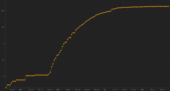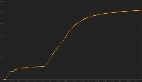France : Cases since the start of the epidemic : 182,709 cases +673 in 24 hours (the day before: +21) Active cases : (excluding death and recovery) 89,604 cases -226 (the day before: +19). Death : 28,348 deaths since the start of the epidemic +35 (the day before: +43) Healings : 64,608 people +70 in 24 hours (the day before +338) Graph: Trend of propagation