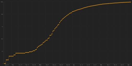 GLOBAL SITUATION : Friday, June 5, 2020, the number of people infected worldwide by the Covid-19 coronavirus since the start of the pandemic (Official source), amounted to 6,658,334 confirmed cases +123,315 cases in 24 hours ( the day before: +129.487). Number of contaminated countries 188 (unchanged). Bulletin from the day before : https://www.haitilibre.com/article-30944-haiti-covid-19-bulletin-quotidien-4-juin-2020.html Since the start of the pandemic 2,886,183 have been cured of Covid-19 worldwide +61,461 people (the day before: +76,813). Since the start of the pandemic 391,488 people have died from Covid-19 worldwide +5,124 in 24 hours (the day before: +5,691). The number of active cases worldwide (excluding deaths and cures) is currently 3,380,663 cases +103,813 in 24 hours (the day before: +46,983). TOP 5 of the countries with the most active cases : 1st - USA: 1,279,447 cases +14,360 in 24h (the day before: +3,315) 2nd - Brazil: 325,957 cases +13,106 in 24h (the day before: +12,305) 3rd - United Kingdom: 241,873 cases +1,626 in 24 hours (the day before: +1,516) 4th - Russia: 231,499 cases +534 in 24h (the day before: +17) 5th - India: 111,444 cases +3,812 in 24h (the day before +5,406) TOP 5 of the countries with the most deaths : 1st - USA: 108,211 deaths +1,036 in 24 hours (the day before: +994) 2nd - United Kingdom 39,987 deaths +176 in 24h (the day before: +359) 3rd - Brazil: 34,021 deaths +1,473 in 24 hours (the day before: +1,349) one place ahead 4th - Italy: 33,689 deaths +88 in 24 hours (the day before: +71) 5th - France: 29,045 deaths +44 in 24 hours (the day before: +81) DIASPORA : United States : Cases since the start of the epidemic : 1,872,660 cases +21,140 in 24 hours (the day before: +19,699) Healings : 485,002 people +5,744 (the day before +15,390) Death : 108,211 deaths +1.036 in 24 hours (the day before: +994) Active cases (less death and recovery): 1,279,447 cases +14,360 in 24 hours (the day before: +3,315) Graph: Trend of propagation