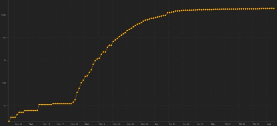 Canada : Cases since the start of the epidemic : 95,269 cases +628 in 24 hours (the hurdy-gurdy +680) Healings : 52,184 people +678 in 24h (the day before +781) Death : 7,717 deaths +138 in 24 hours (the day before: +102) Active cases : (excluding death and recovery) 35,368 active cases -188 in 24 hours (the day before: -203) Graph: Trend of propagation