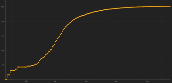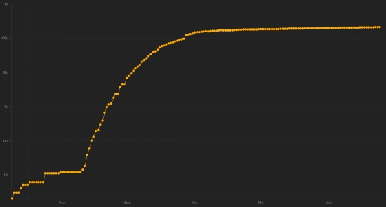 France : Cases confirmed since the first case : 207.356 (+621), the day before (+663) Healings : 78,159 people (+174 in 24h), the day before (+341) National Healing Rate : 37.69% (-) Death : 29,980 deaths (+14), the day before (+32) Active cases : (excluding death and recovery) 99.217 (+133), previous (+590) Graph: Trend of propagation