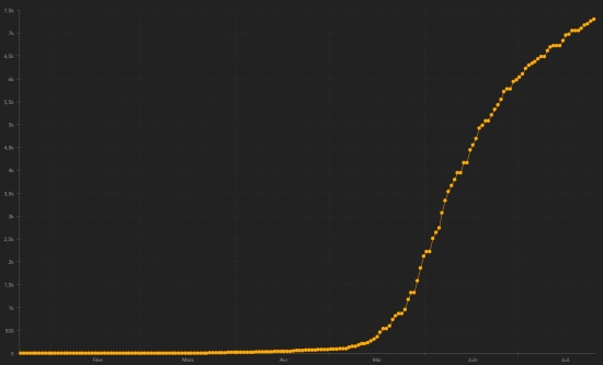WORLD SITUATION : Sunday July 26, 2020, the number of people infected worldwide with the Covid-19 coronavirus since the start of the pandemic (Official source), amounts to 16,055,909 confirmed cases (+296,258 in 24 hours) , the day before: (+233,594). Number of contaminated countries 188 (unchanged) Bulletin of the day before : https://www.haitilibre.com/en/news-31372-haiti-covid-19-daily-report-july-25-2020.html Since the start of the pandemic 9,267,601 people have been cured of Covid-19 around the world (+205,192 in 24 hours), the day before: (+189,024) Since the start of the pandemic 644,661 people have died from Covid-19 around the world (+4,408 in 24 hours), the day before (+6,597) The number of active cases in the world (excluding deaths and recoveries) is currently 6,143,647 cases (+86,652 in 24 hours), the day before: (+40,979) Average cure rate in the world : 57.72% (+) Average death rate in the world : 4.02% (-) TOP 5 countries with the most active cases : 1st - USA: 2,752,853 cases (+47,372 in 24 hours), the day before (+44,191) 2nd - Brazil: 522,705 cases (+13,682 in 24 hours) the day before (-29,979) 3rd - India: 468,002 cases (+11,768 in 24 hours), the day before (+15,936) 4th - United Kingdom: 253,020 cases (+707 in 24 hours), the day before (+646) 5th - Russia: 198,652 cases (+2,556 in 24 hours), the day before (-2,649) TOP 5 countries with the most deaths : 1st - USA: 146,463 deaths (+917 in 24 hours), the day before (+1,241) 2nd - Brazil: 86,449 deaths (+1,211 in 24 hours), the day before (+1,156) 3rd - United Kingdom 45,823 deaths (+61 in 24 hours), the day before (+123) 4th - Mexico: 43,572 deaths (+737 in 24 hours), the day before (+737) 5th - Italy: 35,102 deaths (+5 in 24 hours), the day before (+5) DIASPORA : United States : Cases since the start of the epidemic : 4,178,730 cases (+66,079 in 24 hours), the day before (+73,787) Healings : 1,279,414 people (+17,790 in 24 hours), the day before (+28,355) National Healing Rate : 30.62% (-) Deaths : 146,463 deaths (+917 in 24 hours), the day before (+1,241) Active cases (less deaths and cures): 2,752,853 cases (+47,372 in 24 hours), the day before (+44,191) Canada : Cases since the start of the epidemic : 115,470 cases (+355 in 24 hours), the day before (+717) Healings : 100,765 people (+261 in 24 hours), the day before (+567) National Healing Rate : 87.27% (-) Deaths : 8,929 deaths (+6 in 24h), the day before (+6) National death rate : 7.73% (-) Active cases : (excluding death and recovery) 5,776 cases (+88 in 24 hours), the day before (+146) France : (NOTE : Santé Publique France has not published an update on the situation. The data below is therefore the same as that of our bulletin the day before.) Epidemiological situation : Cases confirmed since first case : 217,797 (+1,130), previous (+1,062) Healings : 80,804 people (+343), previous (+515) National Healing Rate : 37.10% (-) Deaths : 30,172 deaths (+10 correction from Public Health France), previous (+10) Active cases : (excluding death and recovery) 106,821 (+777), previous (+537) Latin America and the Caribbean active cases : Brazil : 522,705 cases (+13,682 in 24 hours) the day before (-29,979) Peru : 94,988 cases (-3707 in 24 hours), the day before (+1,198) Argentina : 87,419 cases (+2,153 in 24 hours), the day before (+2,756) Dominican Republic : 31,861 cases (+1,445 in 24 hours), the day before (+712) Panama : 24,161 (+122 in 24 hours), the day before (+259) Chile : 18,403 cases (-291 in 24h), previous (+204 in 72h) French Guiana : 6,404 cases (+81 in 24 hours), the day before (+130) Haiti : 2,775 cases (-93 in 24 hours), previous (+61) Bahamas : 224 cases (+10), the day before (+42) advance one place Martinique : 161 cases (unchanged in 24 hours), the day before (+7) Jamaica : 116 cases (+6), the day before (+10) Guadeloupe : 106 cases (unchanged in 24 hours), the day before (+8) Cuba : 46 cases (+5 in 24 hours), the day before (+1) HAITI : Epidemiological situation : According to the Ministry of Public Health, 37 new cases of Covid-19 would have been confirmed in Haiti in 24 hours the day before (+63), for a total of 7,297 cases throughout the national territory (41.0% of women and 59.0% men) from the first case (March 19, 2020 https://www.haitilibre.com/en/news-30319-haiti-health-origin-of-the-first-2-cases-of-covid-19-in-haiti.html ). Deaths : 1 new death was recorded in Grand'Anse, bringing the national total to 157. Healings :: 4,365 people (+129 in 48 hours) Healing rate : 59.82% (+) Active cases : (less deaths and cures) 2,775 cases (-93 in 24 hours), previous (+61) Imported cases : 152 cases since the reopening of airports and +43 since the last report dated July 9 (109) https://www.haitilibre.com/en/news-31348-haiti-flash-152-cases-imported-since-the-reopening-of-airports.html (update not available) Number of suspected cases investigated since March 19 : 17,343 cases (+141 in 24 hours), previous (+124) Number of cases tested since the start of the pandemic : 17,023 tests as of July 24 (+514 in 48 hours) People currently hospitalized : (information not available) People in intensive care currently : (information not available) People in home quarantine currently : (information not available) Graph *: daily confirmed cases