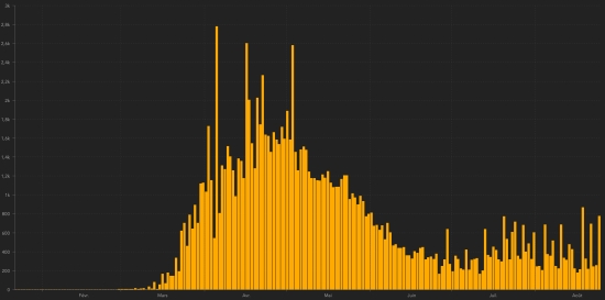 After a plateau phase reached on July 22, the number of new cases worldwide has been falling for 10 days now. Average cure rate in the world : 64.87% (+) Average death rate in the world : 3.44% (-) TOP 5 countries with the most active cases : 1st - USA: 3,542,856 cases (+13,840 in 24 hours), the day before (+22,617) 2nd - India: 704,348 cases (-6,423 in 24 hours), the day before (+3,083) 3rd - Brazil: 531,296 cases (-10,928 in 24 hours), the day before (-11,922) 4th - United Kingdom: 285,551 cases (+970 in 24 hours), the day before (+1,042) 5th - Spain: 226,188 (+19,338 in 24h) TOP 5 countries with the most deaths : 1st - USA: 177,279 deaths (+471 in 24 hours), the day before (+446) 2nd - Brazil: 115,309 deaths (+565 in 24 hours), the day before (+494) 3rd - Mexico: 60,800 deaths (+320 in 24 hours), the day before (+226) 4th - India: 58,390 (+848 in 24 hours), the day before (+836) 5th - United Kingdom 41.519 (+4 in 24 hours), the day before (+6) TOP 5 countries with the highest total number of healings : 1st - Brazil: 2,976,256 (+27,441 in 24 hours), cure rate 82.15% (+) 2nd - India: 2,404,585 (+66,550 in 24h), cure rate 75.92% (+) 3rd - USA: 2,020,774 people (+23,013 in 24 hours), cure rate 35.2% (+) 4th - Russia: 777,960 (+6,603 in 24h), cure rate 80.73% (+) 5th - South Africa: 516,494 (+10,024 in 24h), cure rate 84.47% (+) DIASPORA : United States : Cases since the start of the epidemic : 5,740,909 cases (+37,324 in 24 hours), the day before (+35,240) Healings : 2,020,774 people (+23,013 in 24 hours), the day before (+12,277) National Healing Rate : 35.2% (+) Death : 177,279 deaths (+471 in 24 hours), the day before (+446) Active cases (less deaths and cures): 3,542,856 cases (+13,840 in 24 hours), the day before (+22,617) Canada : Cases since the start of the epidemic : 127,594 cases (+777 in 24 hours), the day before (+257) Healings : 113,449 people (+613 in 24 hours), the day before (+215) National Healing Rate : 88.91% (-) Death : 9,129 deaths (+10 in 24 hours), the day before (+2) National death rate : 7.15% (-) Active cases : (excluding death and recovery) 5,016 cases (+154 in 24 hours), the day before (+40) COUNTRY: Number of daily confirmed cases
