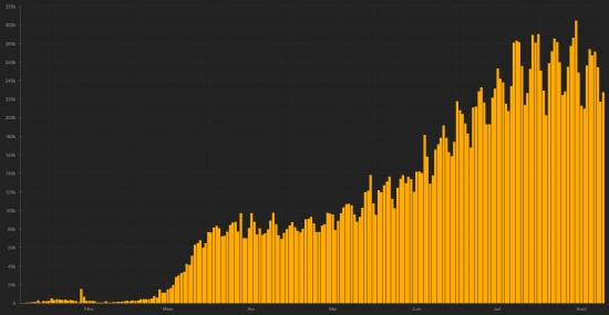 WORLD SITUATION : Tuesday, August 25, 2020, the number of people infected worldwide by the Covid-19 coronavirus since the start of the pandemic (Official source), amounted to 23,676,599 confirmed cases (+222,131 in 24 hours) , the day before (+235,556). Number of contaminated countries 188 (unchanged) Bulletin of the day before : https://www.haitilibre.com/en/news-31623-haiti-covid-19-daily-report-august-24-2020.html Since the start of the pandemic 15,358,319 people (+202,901 in 24 hours) have been cured of Covid-19 around the world, the day before (+218,194) Since the start of the pandemic 813,789 people have died from Covid-19 worldwide (+4,456 in 24 hours), the day before (+4,645) The number of active cases in the world (excluding deaths and recoveries) is currently 7,504,491 cases (+14,775 in 24 hours), the day before (+12,717) World: Number of daily confirmed cases