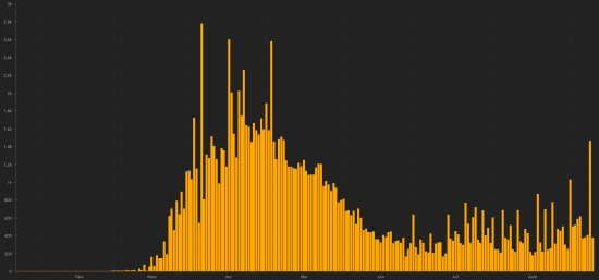 In the deconfinement phase, the Covid remains active and Canada records several one-off peaks of 24 hours. However, the number of new cases remains in a magnitude that does not allow us to say at this time that Canada is on an upward trend. France: Confirmed cases since the first case: 377,860 (+8,577 in 24h), previous (+6,544) Healings: 88,494 people (+298 in 24 hours), the day before (+390) National Healing Rate: 23.42% (+) Deaths: 30,810 deaths (+30 in 24 hours), the day before (+39) Active cases: (excluding death and cures) 259.186 (+8.879 in 24h), The day before (+6.115) Latin America and the Caribbean active cases: Brazil: 457,718 cases (-4,470 in 24 hours), the day before (-9,445) Peru: 129,108 cases (-2,740 in 24 hours), the day before (-6,040) Argentina: 119.145 (-3.894 in 24 hours), the day before (+2.549) Colombia: 111.913 (-4.269 in 24 hours), the day before (-4.772) Mexico: 39.758 cases (+523 in 24 hours), the day before (+841) Panama: 25.507 (-42 in 24 hours), the day before (+317) Dominican Republic: 24,718 cases (+271 in 24 hours), the day before (-359) Chile: 15,770 cases (-359 in 24 hours), previous (-776) Ecuador: 10,223 cases (+1,335 in 24 hours), the day before (+614) French Guiana: 7,741 cases (+15 in 24 hours), the day before (+24) Haiti: 2,179 (+8), previous (-44) Jamaica: 2,380 cases (+85), the day before (+120) Bahamas: 1,475 cases (-31 in 48h), previous (-6) Guadeloupe: 2,128 cases (+82 in 24 hours), the day before (-11) Martinique: 811 cases (unchanged in 24 hours), previous (+179) Cuba: 628 (+55 in 24h), the day before (-35) HAITI: Epidemiological situation: According to the Ministry of Public Health, 7 new cases of Covid-19 have been confirmed in Haiti as of September 7, 2020 (latest data available) for a total of 8,384 cases throughout the territory national since the first case (March 19, 2020 https://www.haitilibre.com/en/news-30319-haiti-health-origin-of-the-first-2-cases-of-covid-19-in-haiti.html ). Death: (unchanged). National total of 214 deaths. Healings: : (Unchanged) 5,991 people Healing rate: 71.46% (+) Active cases: (less deaths and recoveries) 2,179 Imported cases: 152 cases since the reopening of airports and +43 since the last report dated July 9 (109) https://www.haitilibre.com/en/news-31348-haiti-flash-152-cases-imported-since-the-reopening-of-airports.html (Since then, this information is no longer made available) Suspicious cases investigated since March 19: 25,059 Cases tested since the start of the pandemic: 24,862 (as of September 7, latest figure available) People currently hospitalized: (information not available) People in intensive care currently: (information not available) People currently treated at home: (information not available) Cases confirmed by department: West: 5,738 cases Artibonitis: 493 cases North: 479 cases Center: 439 cases Southeast: 260 cases Northeast: 244 cases South: 230 cases Northwest: 198 cases Grand'Anse: 162 Nipples: 141 Location of cases: West : 5,738 cases Delmas : 1,392 cases Port-au-Prince : 1,141 cases Pétion-ville : 868 cases Tabarre : 687 cases Croix-des-Bouquets : 568 cases Carrefour : 438 cases Petit-Goâve : 148 cases Cité Soleil : 94 cases Léogâne : 78 cases Cabaret : 74 cases Kenskoff : 60 cases Archaie : 46 cases Gressier 45 cases Anse à Galet : 37 cases Cornillon : 16 cases Grand Goâve : 15 cases Ganthier : 13 cases Thomazeau : 9 cases Fonds-Verettes : 6 cases Pointe à Raquette : 3 cases Artibonite : 493 cases Saint Marc : 164 cases Verettes : 117 cases Gonaïves : 111 case Gros Morne : 22 cases Petite Rivière de l’Artibonite : 17 cases Marchand Dessalines : 16 cases Saint Michel : 11 case L’Estère : 10 cases Desdunes : 6 cases Marmelade : 6 cases Ennery : 6 cases Grande Saline : 3 cases La Chappelle : 2 cases Anse Rouge : 2 cases North : 479 cases Cap Haïtien : 284 cases Limbé : 38 cases Pignon : 21 case Milot : 18 cases Plaine du Nord : 16 cases Borgne : 16 cases Pilate : 15 cases Plaisance du Nord : 14 cases Grande Rivière du Nord : 15 cases Limonade : 11 case Port Margot : 11 case Quartier Morin : 9 cases Acul du Nord : 6 cases Dondon : 3 cases Bahon : 1 case Saint Raphaël : 1 case Center : 439 cases Mirebalais : 158 cases Hinche : 154 cases Boucan Carré : 31 case Lascaobas : 30 cases Belladère : 21 case Thomonde : 14 cases Saut-d’Eau 7 cases Savanette : 6 cases Cerca la Source : 6 cases Maissade : 5 cases Cerca Cavajal : 4 cases Thomassique : 3 cases South-East : 260 cases Jacmel : 194 cases Côte-de-Fer : 15 cases Bainet : 13 cases Thiotte : 10 cases Anse-à-Pitre : 9 cases Vallée de Jacmel : 7 cases Marigot : 6 cases Belle Anse : 4 cases Cayes Jacmel : 2 cases North-East : 244 Ouanaminthe : 76 cases Caracol : 43 cases Fort Liberté : 34 cases Trou du Nord : 33 cases Mombin Crochu 20 cases Terrier Rouge : 11 case Mont Organisé : 7 cases Ste-Suzanne : 5 cases Perches : 5 cases Ferrier : 4 cases Carice : 4 cases Capotille : 2 cases South : 230 cases Cayes : 128 cases Aquin : 26 cases Saint-Louis du Sud : 12 cases Les Anglais : 10 cases Port à Piment : 8 cases Port-Salut : 8 cases Torbeck : 7 cases Chardonnières : 6 cases Camp-Perrin : 6 cases Tiburon : 4 cases Coteaux : 4 cases Chantal : 2 cases St Jean du Sud : 2 cases Île-à Vache : 2 cases Cavaillon 2 cases Roche à Bateau : 1 case Maniche : 1 case North-West : 198 cases Port de Paix : 115 cases Saint-louis du Nord : 26 cases Bombardopolis : 14 cases Môle Saint-Nicolas : 12 cases Jean Rabel : 12 cases Bassin Bleu : 6 cases La Tortue : 5 cases Chansolme : 4 cases Baie de Henne 2 cases Anse-à-Foleur : 2 cases Grand'Anse : 162 cases Jérémie : 129 cases Anse d’Hainault : 16 cases Chambellan : 7 cases Dame Marie : 3 cases Pestel : 2 cases Irois : 2 cases Bonbon : 1 case Moron : 1 case Roseaux : 1 case Nippes : 141 case Miragoâne : 66 cases Fond des Nègres : 20 cases Baradères : 13 cases Plaisance du Sud : 10 cases Anse à Veau 7 cases Petit Trou de Nippes : 7 cases Petite Riviere de Nippes : 6 cases L’As