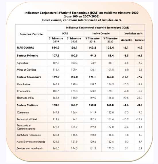 The Haitian Institute of Statistics and Informatics (IHSI) has just made available its quarterly bulletin devoted to short-term economic statistics for the 3rd quarter (April to June) of the 2019-2020 fiscal year. The Conjunctural Economic Activity Indicator (ICAE) is evaluated at 136.1 in the 3rd quarter of 2019-2020, against 144.9 in the 3rd quarter of the previous financial year (2018-2019), i.e. a decrease of 6.1% year-on-year. Summary statistics : Primary Sector : The Primary Sector ICAE recorded a negative year-on-year growth of 6.5% mainly caused by the fall of two sub-sectors : agriculture -6.6% and extractive activities -6.0%. Secondary sector : The ICAE of the Secondary Sector has shown a significant drop of -10.1% following the induced effects of Covid-19 on all branches of the sector. The index of the branch of manufacturing industries, during this period decreased by 10.3% year on year; construction -6.98% and the electricity and water branch contracted -29.5% year-on-year mainly caused by the Electricity Production and Distribution branch -30% and that of water and water q -26.1%. Tertiary sector : The Tertiary Sector achieved negative annual growth of -4.6%, unlike the increase of + 0.9% obtained for the same period of the previous year. Apart from Financial Intermediation Services, Other Merchant Services (+ 0.4%) and Non-Merchant Services (+ 5.1%) which increased, all other components contributed to the decline observed in this sector for the quarter analyzed : Trade -7.3 %; Hotel restaurant: -15.9%; Transport and communication -3.6%; Financial institutions: -4.8%