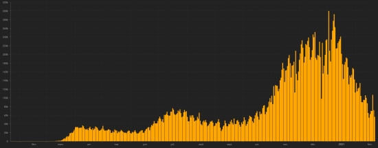Vaccination: 208.32 million doses of vaccine injected (+3.48 million doses injected in 24 hours (updated February 21, 2021, latest data available). TOP 5 countries with the most active cases: (less deaths and recoveries) 1st - USA: 8,662,056 cases, (-18,662 in 24 hours), the day before (-25,859) 2nd - France: 3,341,577 (+21,680 in 24 hours), the day before (+21,125) 3rd - Spain: 2,915,645 cases (update not available 2nd day), the day before (not available) 4th * - United Kingdom 1,500,711 cases (-153,598 in 24 hours), the day before (+9,961) 5th - Brazil: 825,978 cases (+ 3,312 in 24 hours), the day before (-28,187) TOP 5 countries with the most deaths: 1st - USA: 498,897 deaths (+1,249 in 24 hours), the day before (+1,844) 2nd - Brazil: 246,504 deaths (+527 in 24 hours), the day before (+1,240) 3rd - Mexico: 180,107 deaths (+310 in 24 hours), the day before (+1,000) 4th - India: 156,385 deaths (+83 in 24 hours), the day before (+90) 5th * - United Kingdom: 120,580 deaths (+115 in 24 hours), the day before (+445) TOP 5 countries with the highest number of healings: 1st - USA: 18,973,190 healings (+73,918 in 24 hours), cure rate 67.31% (+) 2nd - India: 10,699,410 healings (+9,695 in 24h), cure rate 97.22% (-) 3rd - Brazil: 9,095,692 healings (+25,187 in 24h), cure rate 89.45% (-) 4th - Russia: 3,684,955 healings (+13,472 in 24h), cure rate 89.21% (+) 5th - Turkey: 2,523,760 healings (+5,002 in 24h), cure rate 95.65% (-) DIASPORA: USA: Case since the first case (March 9, 2020): 28,134,143 cases (+56,505), the day before (+71,534) Heals: 18,973,190 healings (+73,918 in 24 hours), the day before (+95,549) National Healing Rate: 67.44% (+) Death: 498,897 deaths (+1,249 in 24 hours), the day before (+ 1,844) Active cases (less deaths and cures): 8,662,056 cases, (-18,662 in 24 hours), the day before (-25,859) Canada: Cases since the start of the epidemic (January 25, 2020): 850,737 cases (+2,407 in 24 hours), the day before (+2,657) Healings: 798,129 people (+2,678 in 24 hours), the day before (+2,996) National Healing Rate: 93.82% (+) Deaths: 21,675 deaths (+44 in 24h), the day before (+50) National death rate: 2.55% (=) Active cases: (excluding death and cures) 30,933 cases (-315 in 24 hours), the day before (-389) Vaccination: 1.4 million doses of vaccine injected (+50,000 doses injected in 24 hours, updated on February 19, 2021, latest data available), since December 14, 2020, date of the first injection in Canada . Canada: Number of daily confirmed cases