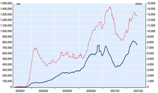 New case in blue numbers on the left - New deaths in red numbers on the right Vaccination: 1.45 billion doses of vaccine injected (+40 million doses injected in 24 hours updated May 15, 2021 latest data available). TOP 5 countries with the most active cases: (less deaths and recoveries) 1st - USA: 5,997,433 cases, (-354,445 in 24 hours), the day before (-8,480) 2nd * - India: 3,618,423 cases (-55,357 in 24 hours), the day before (-31,080) 3rd * - Brazil: 1,093,365 cases (+33,192 in 24 hours), the day before (+33,271) 4th - France: 675,960 (-22,187 in 24 hours), the day before (-36,522) 5th * - Iran: 452,391 cases (-7,131 in 24 hours), the day before (-6,364) TOP 5 countries with the most deaths: 1st - USA: 599,863 deaths (+549 in 24 hours), the day before (+774) 2nd * - Brazil: 434,852 deaths (+2,067 in 24 hours), the day before (+2,189) 3rd * - India: 270,319 deaths (+4,090 in 24 hours), the day before (+3,879) 4th * - Mexico: 220,380 deaths (+221 in 24 hours), the day before (+258) 5th * - United Kingdom: 127,675 deaths (+7 in 24 hours), the day before (+17) TOP 5 countries with the highest number of healings: 1st - USA: 27,098,620 healings (+385,799 in 24h), cure rate 80.42% (+) 2nd * - India: 20,795,335 healings (+362,437 in 24 hours), cure rate 84.24% (+) 3rd * - Brazil: 14,062,396 healings (+34,041 in 24h), cure rate 90.19% (-) 4th * - France: 5,080,344 people (+37,760 in 24 hours), cure rate 86.63% (+) 5th * - Turkey: 4,932,838 people (+38,814 in 24 hours), cure rate 96.59% (+) DIASPORA: United States: * Case since the first case (March 9, 2020): 33,695,916 cases (+31,903 in 24 hours), the day before (+37,916) * Healings: 27,098,620 healings (+385,799 in 24 hours), the day before (+45,622) National Healing Rate: 80.42% (+) * Death: 599,863 deaths (+549 in 24 hours), the day before (+774) * Active cases (less deaths and recoveries): 5,997,433 cases, (-354,445 in 24 hours), the day before (-8,480) Canada: * Cases since the start of the epidemic (January 25, 2020): 1,323,681 cases (+5,276 in 24 hours), previous (+6,644) * Healings: 1,226,870 people (+6,760 in 24 hours), previous (+7,786) National Healing Rate: 92.68% (+) * Death: 24,908 deaths (+39 in 24h), previous (+59) National death rate: 1.88% (=) * Active cases: (excluding death and recovery) 71,903 (-1,523 in 24 hours), previous (-1,201) Vaccination: 18.1 million doses of vaccine injected since December 14, 2020, date of the first injection in Canada (+370,000 doses injected in 24 hours updated May 15, 2021 latest data available). Canada: Number of daily confirmed cases