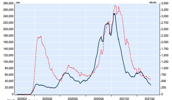 New cases in blue numbers on the left - New deaths in red numbers on the right France: * Cases confirmed since the first case (January 24, 2020): 5,581,351 cases (+12,800), the day before (+ 15,515) * Healings: 5,186,704 people (24,080), the day before () National Healing Rate: 92.92% (+) Death: 108,423 (+109 in 24 hours in hospitals +0 in EMS / EHPAD), the day before in total, (+133) * Active cases: (excluding death and recovery) 286,210 (-11,403), the day before (-11,811) Latin America and the Caribbean active cases (less deaths and recoveries): * Brazil: 1,107,420 cases (+39,215 in 24 hours), the day before (-24,996) * Argentina: 348,976 cases (+9,765 in 24 hours), the day before (+9,466) * Mexico: 262,301 cases (+2,428 in 24 hours), the day before (+749) * Peru: 127,332 cases (+4,890 in 24 hours), the day before (+6,526) * Colombia: 110,208 cases (-4,538 in 24 hours), the day before (-2,324) Dominican Republic: 42,419 cases (+309 in 24 hours) the day before (+601) * Ecuador: 42,015 cases (+1,281 in 24 hours), the day before (+2,305) * Chile: 41,635 cases (+2,919 in 24 hours), the day before (+2,665) * Jamaica: 23,130 cases (+3 in 24 hours), the day before (-23) * Guadeloupe: 14,059 cases (unavailable 2nd day), the day before (unavailable) * French Guiana: 12,673 cases (+170 in 24 hours), the day before (+226) * Martinique: 11.675 (unavailable 3rd day), the day before (unavailable) * Cuba: 6,930 cases (+18 in 24 hours), the day before (-66) * Panama: 5,876 cases (+55 in 48 hours), the day before (+159) Haiti: 976 cases (+91 in 48 hours), previous (+26) advance by one place * Bahamas: 953 cases (unavailable), the day before (+7) HAITI: Epidemiological situation: According to the Ministry of Public Health, 111 new cases of Covid-19 were confirmed in Haiti on May 17 and 18, 2021 (latest partial data available) for a total of 13,735 cases confirmed throughout the national territory since the first case (March 19, 2020 https://www.haitilibre.com/en/news-30319-haiti-health-origin-of-the-first-2-cases-of-covid-19-in-haiti.html). Last update (26 new cases on May 18, 2021) Healings: 12,479 people (+16 in 72h) Healing rate: 90.85% (-) Deaths: 280 deaths, (+4 in 72h) Mortality rate: 2.03% (+) Active cases: (less deaths and cures) 976 cases (+91 in 48 hours), the day before (+26) Imported cases: 152 cases since the reopening of airports and +43 since the last report dated July 9 (109 cases) https://www.haitilibre.com/en/news-31348-haiti-flash-152-cases-imported-since-the-reopening-of-airports.html (Since then, this information is no longer made available) Suspected cases since March 19: 64,789 cases (+555 in 48 hours) update May 16, latest data available. Cases tested since the start of the pandemic: 68,186 67,884 cases (+714 in 48 hours) update 17 May, latest data available. Note that the very low number of people tested does not statistically make it possible to make a representative estimate of the cases of Covid-19 in Haiti. People hospitalized: 2,017 since the start of the epidemic (updated May 18, 2021, latest data available) People in intensive care: (not available) Person in isolation: 976 as of May 17 (latest data available) People currently treated at home: 1,225 as of May 17, latest data available). Cases confirmed by department: West: 9,715 (+79) North: 851 (+11) Artibonite: 707 (+4) +2 (+6) Center: 707 (+8) North-East: 385 (+2) South-East: 307 (unchanged) South: 302 (unchanged) North-West: 292 (+4) Grand'Anse: 241 (+1) Nippes: 161 (unchanged) UNITED STATES: Epidemiological situation: United States: * Case since the first case (March 9, 2020): 33,862,398 cases (+29,217 in 24 hours), the day before (+30,857) * Healings: 27,399,429 healings (+40,778 in 24h), the day before (+59,571) National Healing Rate: 80.91% (+) * Death: 603,408 deaths (+792 in 24 hours), the day before (+667) National death rate: 1.78% (=) * Active cases (less deaths and recoveries): 5,859,561 cases, (-12,353 in 24 hours), the day before (-29,281) * Tests: 471,543,912 people tested since the first case. USA: Number of daily confirmed cases: