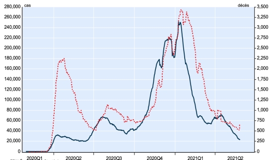 New cases in blue numbers on the left - New deaths in red numbers on the right Vaccination: 1.84 billion doses of vaccine injected (+30 million doses injected in 24 hours updated May 28, 2021 latest data available). TOP 5 countries with the most active cases: (less deaths and recoveries) 1st - USA: 5,646,656 cases, (-43,419 in 24 hours), the day before (-12,685) 2nd * - India: 2,228,724 cases (-114,428 in 24 hours), the day before (-76,727) 3rd * - Brazil: 1,122,220 cases (+23,103 in 24 hours), the day before (+12,287) 4th * - Iran: 396,291 cases (-3,643 in 24 hours), the day before (-7,572) 5th * - Argentina 372,886 cases (+5,280 in 24 hours), the day before (+2,347) TOP 5 countries with the most deaths: 1st - USA: 608,961 deaths (+1,235 in 24 hours), the day before (+1,547) 2nd * - Brazil: 459,171 deaths (+2,418 in 24 hours), the day before (+2,130) 3rd * - India: 322,512 deaths (+3,617 in 24 hours), the day before (+3,632) 4th * - Mexico: 223,068 deaths (+411 in 24 hours), the day before (+425) 5th * - United Kingdom: 127,768 deaths (+10 in 24 hours), the day before (+10) TOP 5 countries with the highest number of healings: 1st - USA: 27,767,040 healings (+65,161 in 24 hours), cure rate 81.61% (+) 2nd * - India: 25,178,011 healings (+284,601 in 24 hours), cure rate 90.79% (+) 3rd * - Brazil: 14,811,266 healings (+24,974 in 24h), cure rate 90.35% (-) 4th * - France: 5,303,714 people (+19,450) in 24 hours, cure rate 93.92% (+) 5th * - Turkey: 5,083,099 people (+12,284 in 24 hours), cure rate 97.22% (+) DIASPORA: United States: * Case since the first case (March 9, 2020): 34,022,657 cases (+22,977 in 24 hours), the day before (+28,473) * Healings: 27,767,040 healings (+65,161 in 24 hours), the day before (+39,611) National Healing Rate: 81.61% (+) * Death: 608,961 deaths (+1,235 in 24 hours), the day before (+1,547) * Active cases (less deaths and recoveries): 5,646,656 cases, (-43,419 in 24 hours), the day before (-12,685) Canada: * Cases since the start of the epidemic (January 25, 2020): 1,374,275 cases (+3,202 in 24 hours), the day before (+2,967) * Healings: 1,308,932 people (+5,374 in 24 hours, the day before (+5,598) National Healing Rate: 95.24% (+) * Death: 25,440 deaths (+29 in 24 hours), the day before (+50) National death rate: 1.85% (=) * Active cases: (excluding death and cures) 39,903 (-2,201 in 24 hours), the day before (-2,681) Vaccination: 22.81 million doses of vaccine injected since December 14, 2020, date of the first injection in Canada (+460,000 doses injected in 24 hours updated May 28, 2021 latest data available). Canada: Number of daily confirmed cases