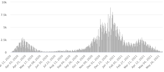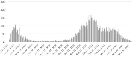 Vaccination: 299.12 million doses of vaccine injected since December 14, 2020, the date of the first injection in the United States (+1.4 million doses injected, in 24 hours). Updated 4 June 2021 last available data). New York State: * Cases since the start of the epidemic (March 1, 2020): 2,158,162 cases (+916 in 24 hours), the day before (+976) * Healings: 1,752,988 healings (+9,043 in 24 hours) the day before (+6,544) Healing rate: 81.22% (+) * Death: 53,715 deaths (+9 in 24 hours), the day before (+52) Death rate: 2.48% (=) * Active cases 351,459 cases (-8,136 in 24 hours), the day before (-5,620) * Tests: 56,505,239 people tested since the first case. New York State: Number of daily confirmed cases: