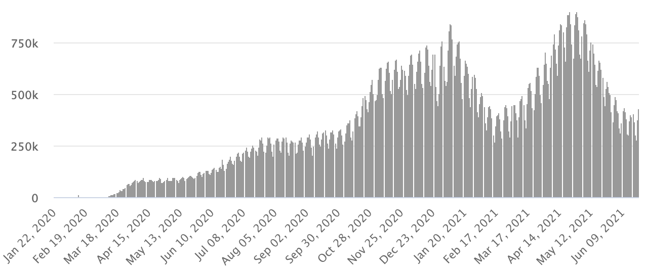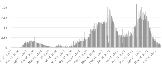 Vaccination: 2.79 billion doses of vaccine injected (+40 million doses injected in 24 hours updated June 23, 2021 latest data available). 1 TOP 5 countries with the most active cases: (less deaths and recoveries) 1st - USA: 4,984,406 cases, (-15,388 in 24 hours), the day before (-35,074) 2nd * - Brazil: 1,179,903 cases (+17,008 in 24 hours), the day before (-15,702) 3rd * - India: 627,024 cases (-16,139 in 24 hours), the day before (-19,358) 4th * - Russia 341,617 cases (+6,109 in 48 hours), the day before (+4,386) 5th * - Argentina 290,792 cases (+10,680 in 24 hours), the day before (+3,042) TOP 5 countries with the most deaths: 1st - USA: 618,294 deaths (+419 in 24 hours), the day before (+412) 2nd * - Brazil: 507,240 deaths (+2,343 in 24 hours), the day before (+2,080) 3rd * - India: 392,014 deaths (+1.323 in 24 hours), the day before (+1.389) 4th * - Mexico: 231,847 deaths (+342 in 24 hours), the day before (+261) 5th * - Peru: 191,073 deaths (+167 in 24 hours), the day before (+261) TOP 5 countries with the highest number of healings: 1st * - India: 29,063,740 healings (+68,885 in 24h), cure rate 96.61% (+) 2nd - USA: 28,846,304 healings (+29,170 in 24 hours), cure rate 83.73% (+) 3rd * - Brazil: 16,483,635 healings (+94,788 in 24h), cure rate 90.71% (-) 4th * - France: 5,583,247 healings (+8,110 in 24 hours), cure rate 96.89% (+) 5th * - Turkey: 5,248,862 healings (+5,917 in 24h), cure rate 97.42% (=) DIASPORA: United States: * Case since the first case (March 9, 2020): 34,449,004 cases (+14,201 in 24 hours), the day before (+14,965) * Healings: 28,846,304 healings (+29,170 in 24 hours), the day before (+49,627) National Healing Rate: 83.73% (+) * Death: 618,294 deaths (+419 in 24 hours), the day before (+412) * Active cases (less deaths and recoveries): 4,984,406 cases, (-15,388 in 24 hours), the day before (-35,074) Canada: * Cases since the start of the epidemic (January 25, 2020): 1,410,927 cases (+721 in 24 hours), the day before (+599) * Healings: 1,375,107 people (+1,218 in 24 hours, the day before (+1,398) National Healing Rate: 97.46% (+) * Death: 26,175 deaths (+20 in 24 hours), the day before (+71) National death rate: 1.85% (=) * Active cases: (excluding death and cures) 9,645 (-517 in 24 hours), the day before (-870) * Tests: 36,344,745 people tested since the first case. Vaccination: 33.59 million doses of vaccine injected since December 14, 2020, date of the first injection in Canada (+520,000 doses injected in 48 hours updated June 23, 2021 latest data available). Canada: Number of active cases since the start of the pandemic (less deaths and recoveries)