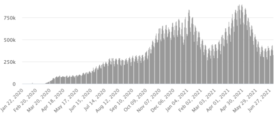 Vaccination: 3.22 billion doses of vaccine injected (+30 million doses injected in 24 hours updated July 4, 2021 latest data available). 1 TOP 5 countries with the most active cases: (less deaths and recoveries) 1st - USA: 4,874,268 cases, (-5,232 in 24 hours), the day before (-6,656) 2nd * - Brazil: 1,162,457 cases (-22,061 in 24 hours), the day before (+8,468) 3rd * - India: 482,041 cases (-3,299 in 24 hours), the day before (-8,468) 4th * - United Kingdom: 440,556 cases (+21,328 in 24 hours), the day before (+24,466) 5th * - Russia 413,274 cases (+9,159 in 48 hours), the day before (+14,838) TOP 5 countries with the most deaths: 1st - USA: 621,293 deaths (+38 in 24 hours), the day before (+94) 2nd * - Brazil: 524,475 deaths (+776 in 24 hours), the day before (+1,631) 3rd * - India: 402,758 deaths (+743 in 24 hours), the day before (+947) 4th * - Mexico: 233,622 deaths (+42 in 24 hours), the day before (+155) 5th * - Peru: 193,230 deaths (+161 in 48 hours), the day before (+167) TOP 5 countries with the highest number of healings: 1st * - India: 29,700,430 healings (+42,352 in 24 hours), cure rate 97.10% (+) 2nd - USA: 29,096,816 healings (+9,395 in 24 hours), cure rate 84.11% (+) 3rd * - Brazil: 17,082,876 healings (+49,068 in 24 hours), 91.01% cure rate (+) 4th * - France: 5,630,202 healings (+672 in 24 hours), cure rate 97.30% (-) 5th * - Turkey: 5,314,930 healings (+4,161 in 24 hours), cure rate 97.61% (=) DIASPORA: United States: * Case since the first case (March 9, 2020): 34,592,377 cases (+4,201 in 24 hours), the day before (+7,978) * Healings: 29,096,816 healings (+9,395 in 24 hours), the day before (+14,540) National Healing Rate: 84.11% (+) * Death: 621,293 deaths (+38 in 24 hours), the day before (+516) * Active cases (less deaths and recoveries): 4,874,268 cases, (-5,232 in 24 hours), the day before (-6,656) Canada: * Cases since the start of the epidemic (January 25, 2020): 1,416,969 cases (+308 in 24 hours), the day before (+344) * Healings: 1,384,448 people (+391 in 24 hours, the day before (+413) National Healing Rate: 97.70% (+) * Death: 26,360 deaths (+12 in 24 hours), the day before (+10) National death rate: 1.86% (=) * Active cases: (excluding death and recovery) 6,161 cases (-95 in 24 hours), the day before (-79) * Tests: 36,946,410 people tested since the first case. Vaccination: 39.1 million doses of vaccine injected since December 14, 2020, the date of the first injection in Canada (+320,000 million doses injected in 24 hours updated July 4, 2021 latest data available). Canada: Number of daily confirmed cases: