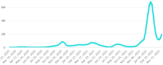 (Day-1) Vaccination: 11.26 billion doses of vaccine injected (+20 million doses injected in 24 hours. Update March 28, 2022 (latest data available). HAITI: Warning: The Ministry of Public Health and Population (MSPP) did not make available after March 22, 2022 daily data on the Covid-19 situation in Haiti. Accordingly, the data below on the situation in Haiti are the latest available. According to the Ministry of Public Health, +13 new cases of Covid-19 and its variants have been confirmed in Haiti as of March 22, 2022 (latest partial data available ) for a total of 30,522 confirmed cases throughout the national territory (48.7% women and 51.3% men), since the first case (March 19, 2020 https://www.haitilibre.com/en/news-30319-haiti-health-origin-of-the-first-2-cases-of-covid-19-in-haiti.html ). Previous update (+15 cases as of March 18, 2022). Healings: 27,960 (+468) Cure rate: 91.60% (+) Deaths: 833 deaths (+6) (West +2, Center +1, South-East+1, Artibonite +2) Death rate: 2.72% (+) 5th Wave (Omicron Dominant): Total of the 5th wave (starting December 27, 2021) 4,528 confirmed cases and 67 deaths Haiti: Active Cases Trend: (less recoveries and deaths)